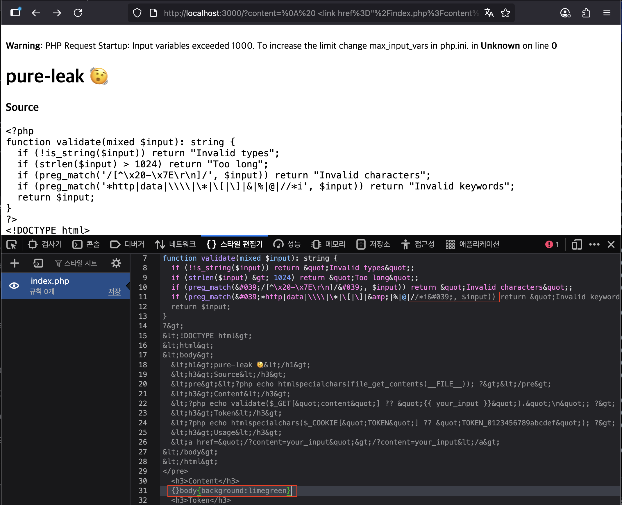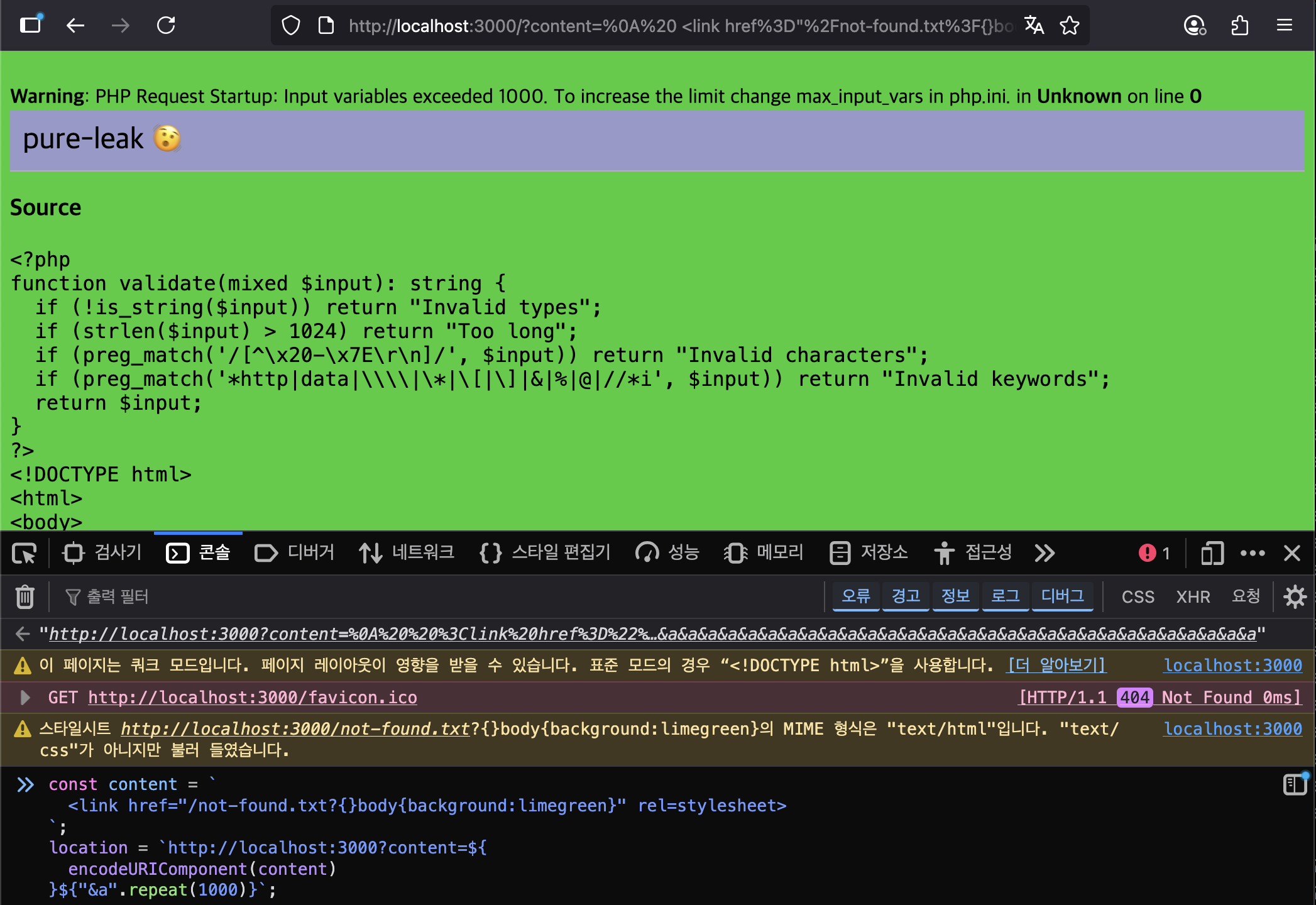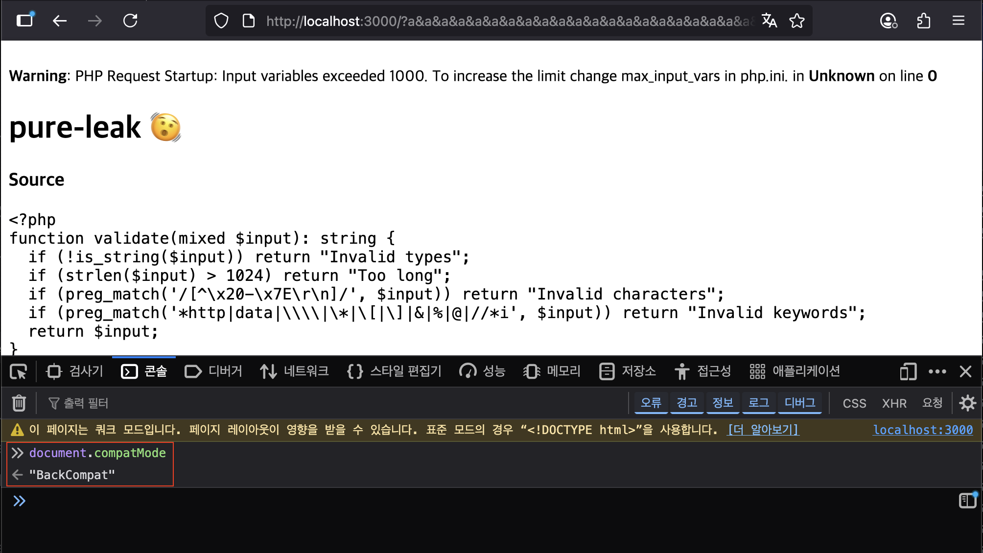 설정 파일에 CSP 정책이 설정되어 있어 CSP 정책을 무력화할 수 없습니다. 다만, 파라미터 개수 제한 초과로 인해 <!DOCTYPE html>